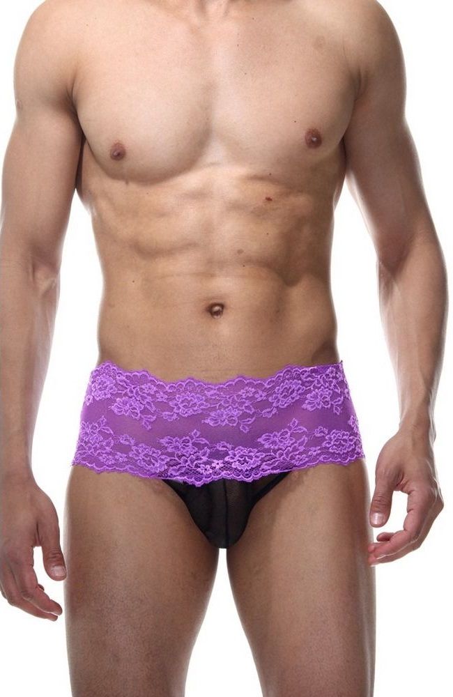 Мужские танга с высокой посадкой, на широком поясе из фиолетового кружева. Сзади черная шнуровка на всю высоту трусов. Низ трусов из черной тянущейся гладкой ткани.