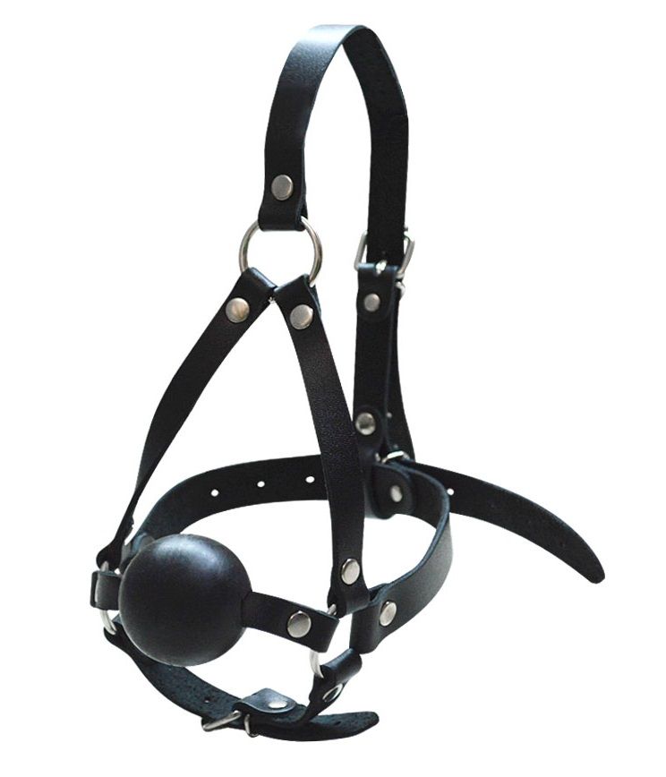 Черный кляп-шар со сбруей на голову из кожи.