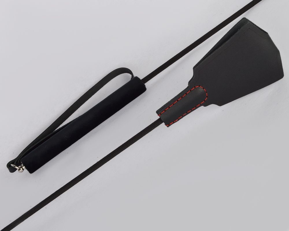 Стек состоит из жесткой рукояти, гибкого полимерного хлыста и расширяющейся хлопушки из натуральной кожи. Декорирован контрастной строчкой.