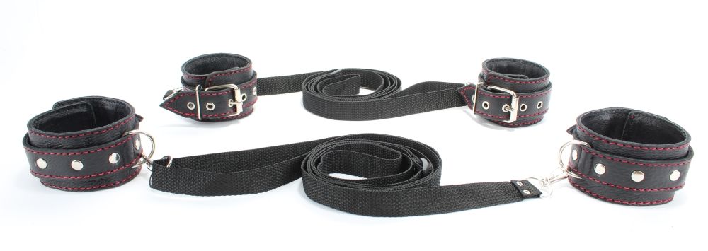 Идеальный бондажный набор для игр со связыванием в постели. Не нужно долго подготавливаться к ролевой игре, связывать веревки, затягивать их вокруг кровати и выдумывать сложные узлы. Секс-игрушка предусмотрела все за Вас. Бондажный набор состоит из нескольких комплектующих: две пары оков и и 2 ремнями на карабине, при помощи которых легко зафиксировать Вашу жертву. Секс-игрушка откроет для Вас целый мир сексуальных утех с привязыванием и подчинением. В комплекте: наручники, поножи, 2 карабина. Ширина оков - 5,2 см.