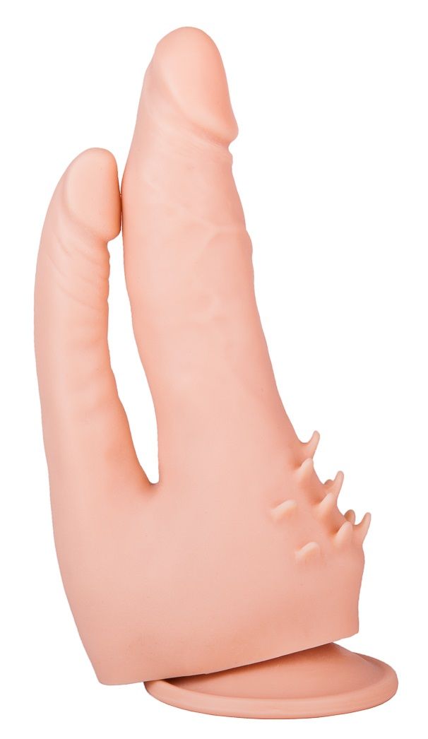Может ли интимная игрушка одновременно стимулировать внутри и снаружи? Эта модель с подошвой-присоской способна на большее! Стимулятор представляет собой слившиеся воедино фаллосы разного размера. Большой, с рисунком напряжённых вен, предназначен для вагинальных ласк. Тоненький идеально подходит для чувственных анальных проникновений. Пока фаллосы массируют стеночки лона и ануса, мяконькие шипы снаружи обеспечивают воздействие на клитор. Лёгкий массаж этой зоны приумножит и без того мощное удовольствие от двойного проникновения. Диаметр анального отростка – 2,1 см.
