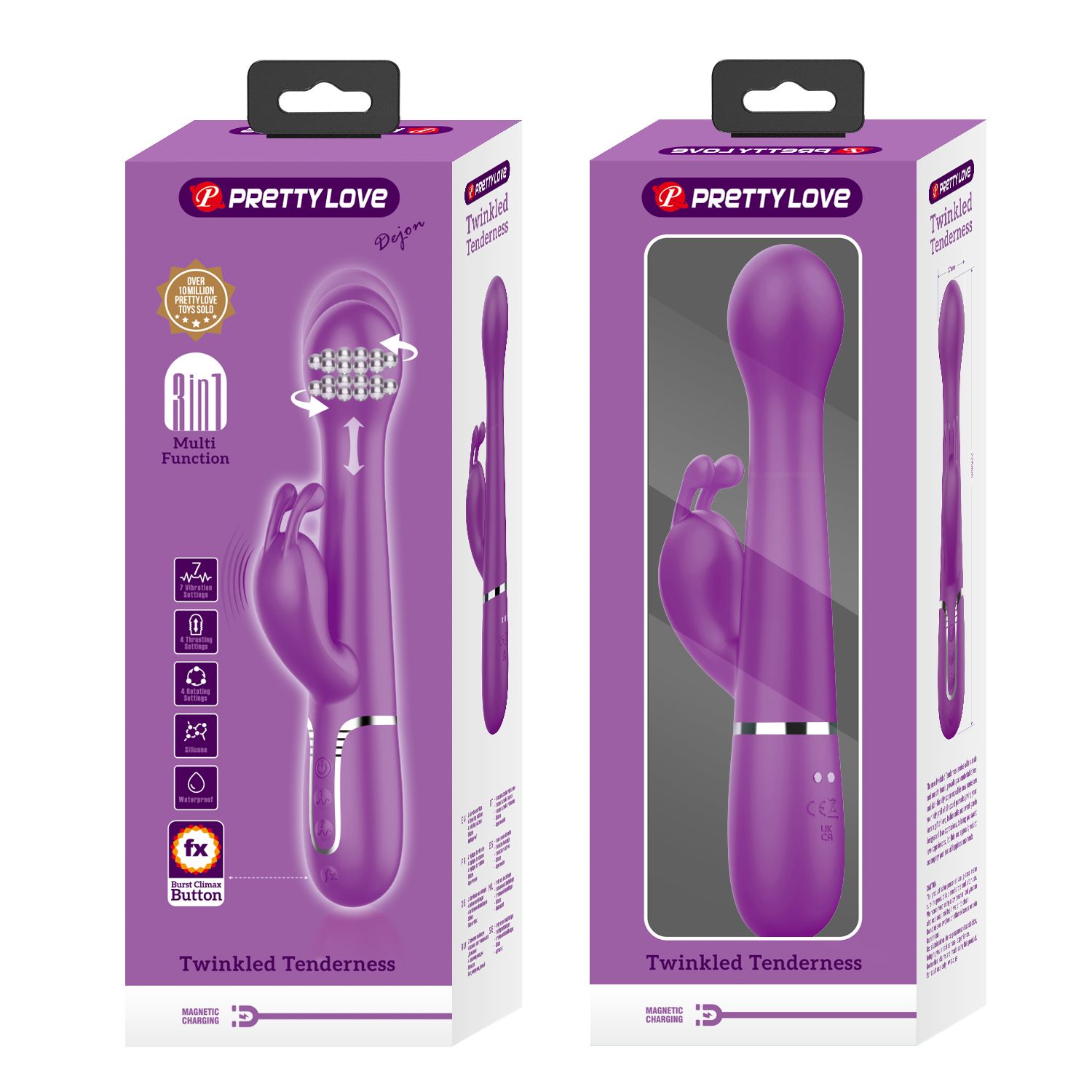 Вибратор предназначен для вагинальной и клиторальной стимуляции. Изготовлен из безопасного для тела силикона . Вибратор оснащен двумя моторами: один расположен в наконечнике, другой — в наружном отростке. Устройство предлагает 7 режимов вибрации, 4 функции вращения и 4 режима толчков. Однорядные жесткие шарики внутри ствола обеспечивают дополнительную стимуляцию. Заряжается через магнитный USB кабель, что делает его удобным для использования. Рабочая длина - 12,5 см.